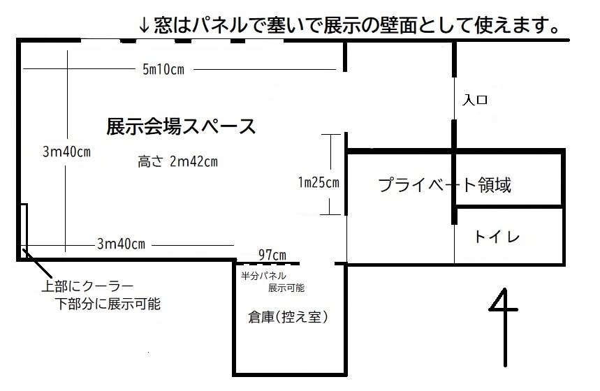※会場の北側の窓はパネルで塞げます。それにより壁面は最大の広さで利用できます。